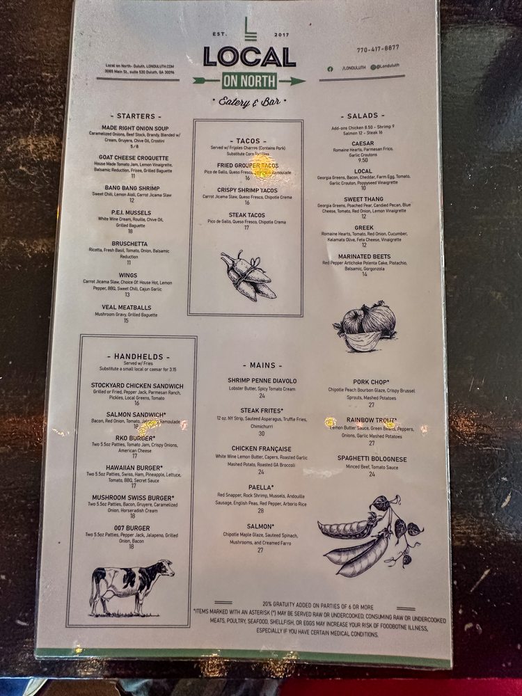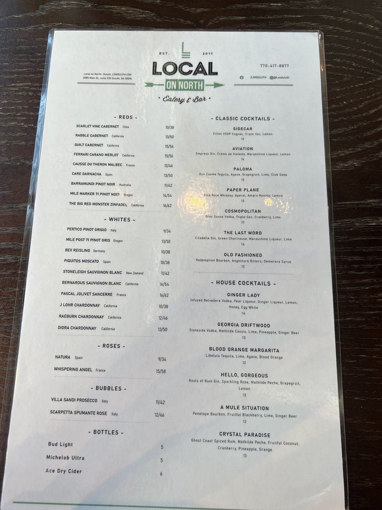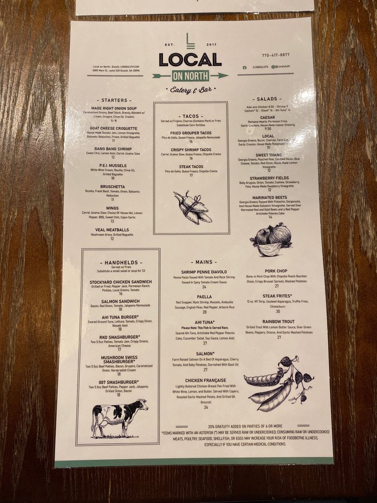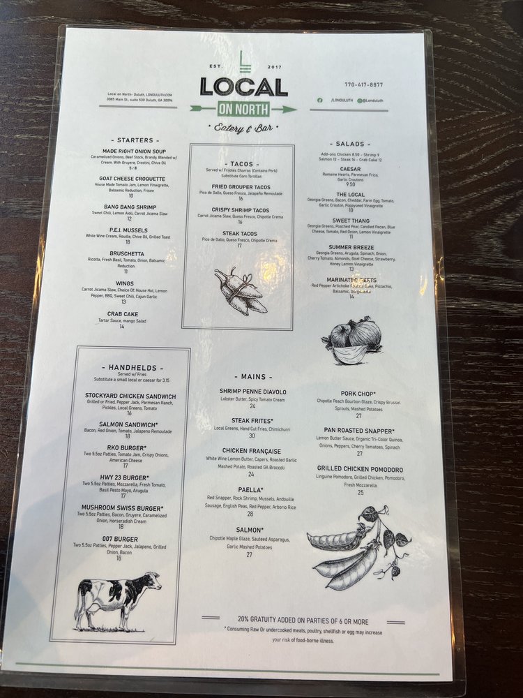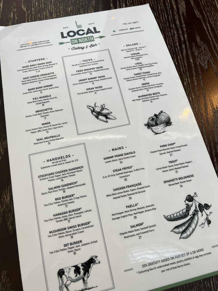 Local On North - Duluth is a trendy New American bar located in Duluth, GA. Offering a diverse menu with pescatarian and vegetarian options, the restaurant stands out for its delicious dishes and top-notch service. Customer reviews praise the flavorful food, such as the salmon sweet thang salad, pork tacos, barbecue sauce, and shrimp diavolo. The ambiance is welcoming, with options for outdoor seating, private dining, and a full bar with specialties like espresso martinis. The 007 smash burger and fish tacos are highlighted as must-try items, accompanied by house-made sauces and unique flavors. Despite some delays, the overall dining experience is exceptional, with memorable dishes like the paella with red snapper. Local On North - Duluth is a must-visit for those seeking a delightful culinary adventure in a vibrant setting.